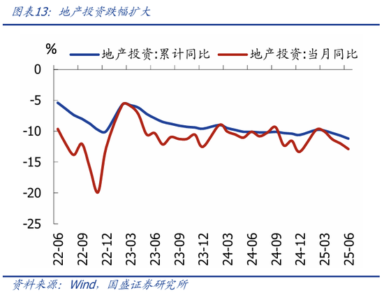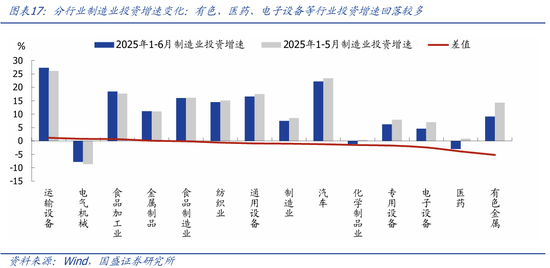 >制造业投资加速回落,“反内卷”影响初步显现。1-6月制造业投资累计同比7.5%,较前值回落1个百分点,6月当月同比5.1%,较前值回落2.7个百分点;应是与“反内卷”限产、出口回落预期有关。企业投资意愿维持低位。分行业看,有色、医药、电子设备等行业投资增速回落较多,这也是我们前期报告分析中,内卷压力较大的行业。(具体请参考《调整就是机会—2025年中期经济与资产展望》中观面专题一:四大维度对比各行业“内卷”压力)。