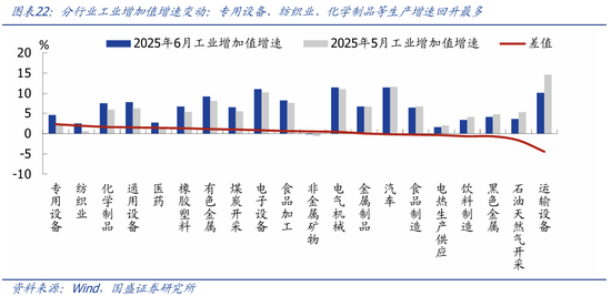 分行业看,专用设备、纺织业、化学制品等生产增速回升最多,可能与出口反弹有关;运输设备、石油开采、黑色金属等生产增速回落最多。