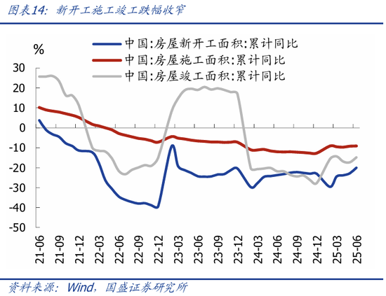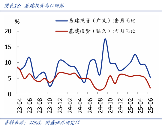 基建投资高位回落。2025年1-6月广义、狭义基建投资同比分别为8.9%、4.6%,分别较前值回落1.5、1.0个百分点,背后可能是财政支出进度不及预期。