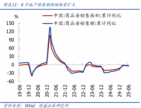 >地产销售、投资、房价环比的跌幅均扩大。1-6月商品房销售面积、销售额同比分别为-3.5%、-5.5%。6月70城二手房价同比跌幅收窄至-6.1%,但环比跌幅扩大至-0.6%。1-6月地产投资累计同比-11.2%,较前值-10.7%跌幅扩大,新开工施工竣工跌幅略有收窄。