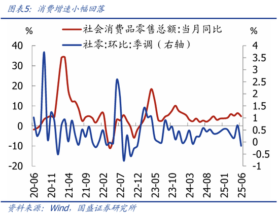 6月消费增速回落、低于预期。6月社零同比4.8%,较前值回落1.6个点,低于市场预期的5.6%;6月社零季调环比-0.16%,较5月的0.69%回落。