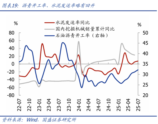 从高频数据看,2025年6-7月沥青开工率、水泥发运率略有回升,整体仍在低位。